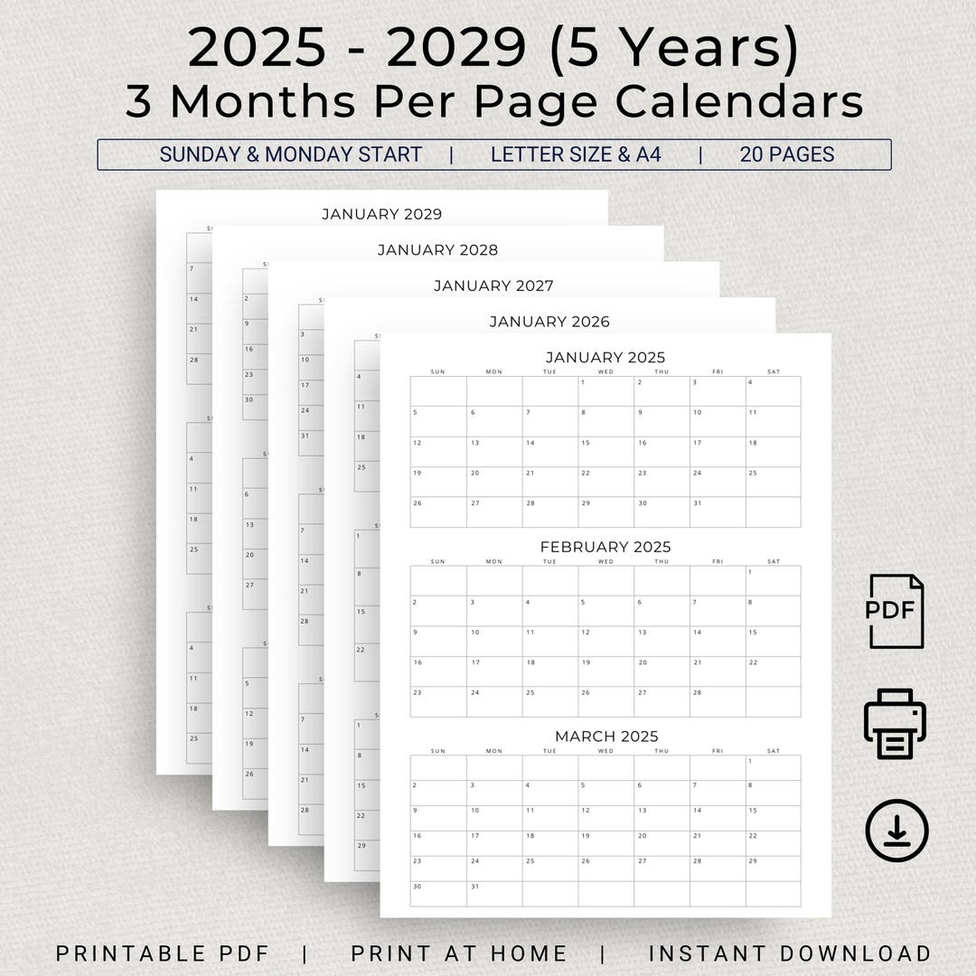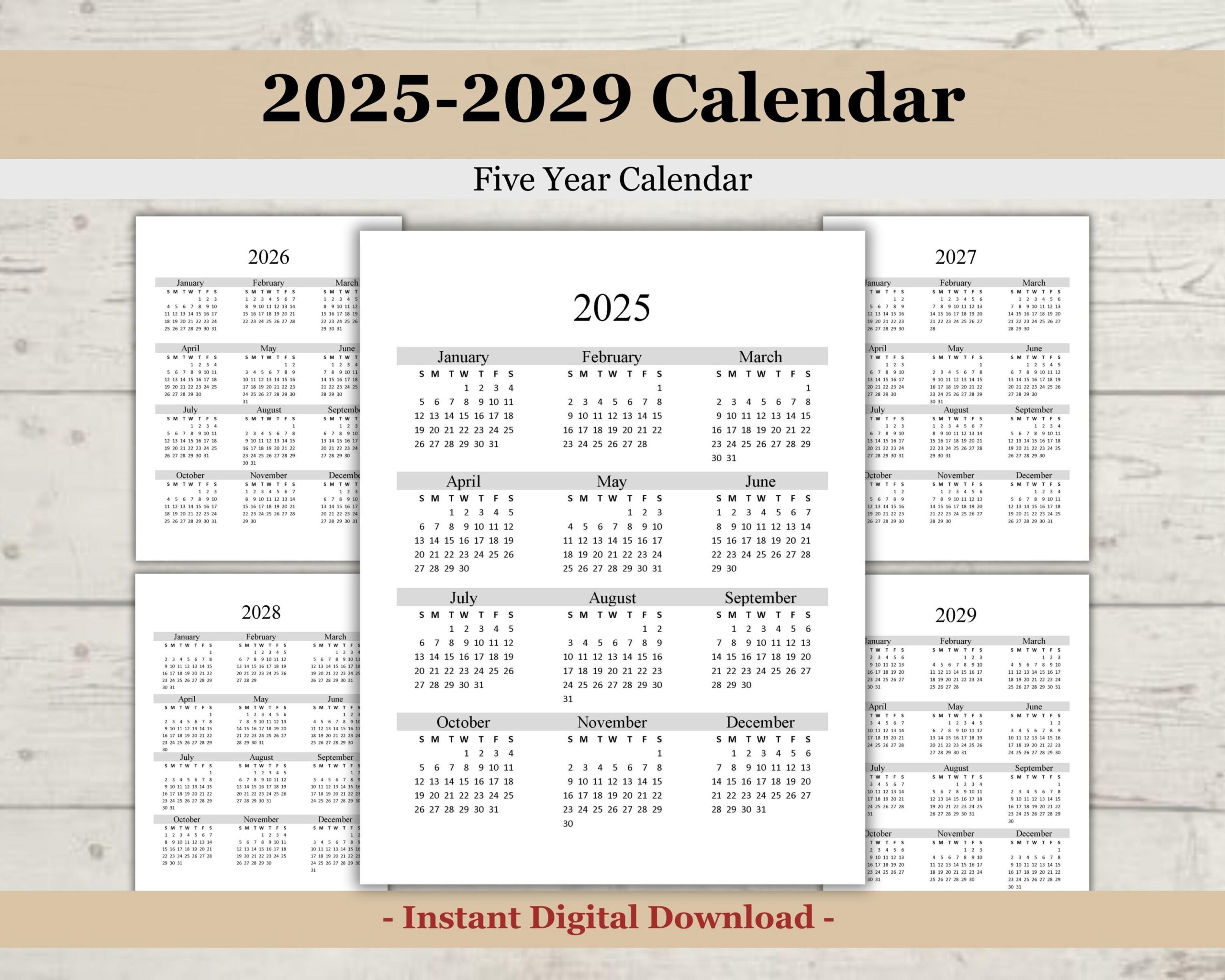 Printable 2025 2029 5 Year Calendar 2025 Printable Calendar 2026 2027 2028 2029 Calendar Printable Five Year Planner Etsy